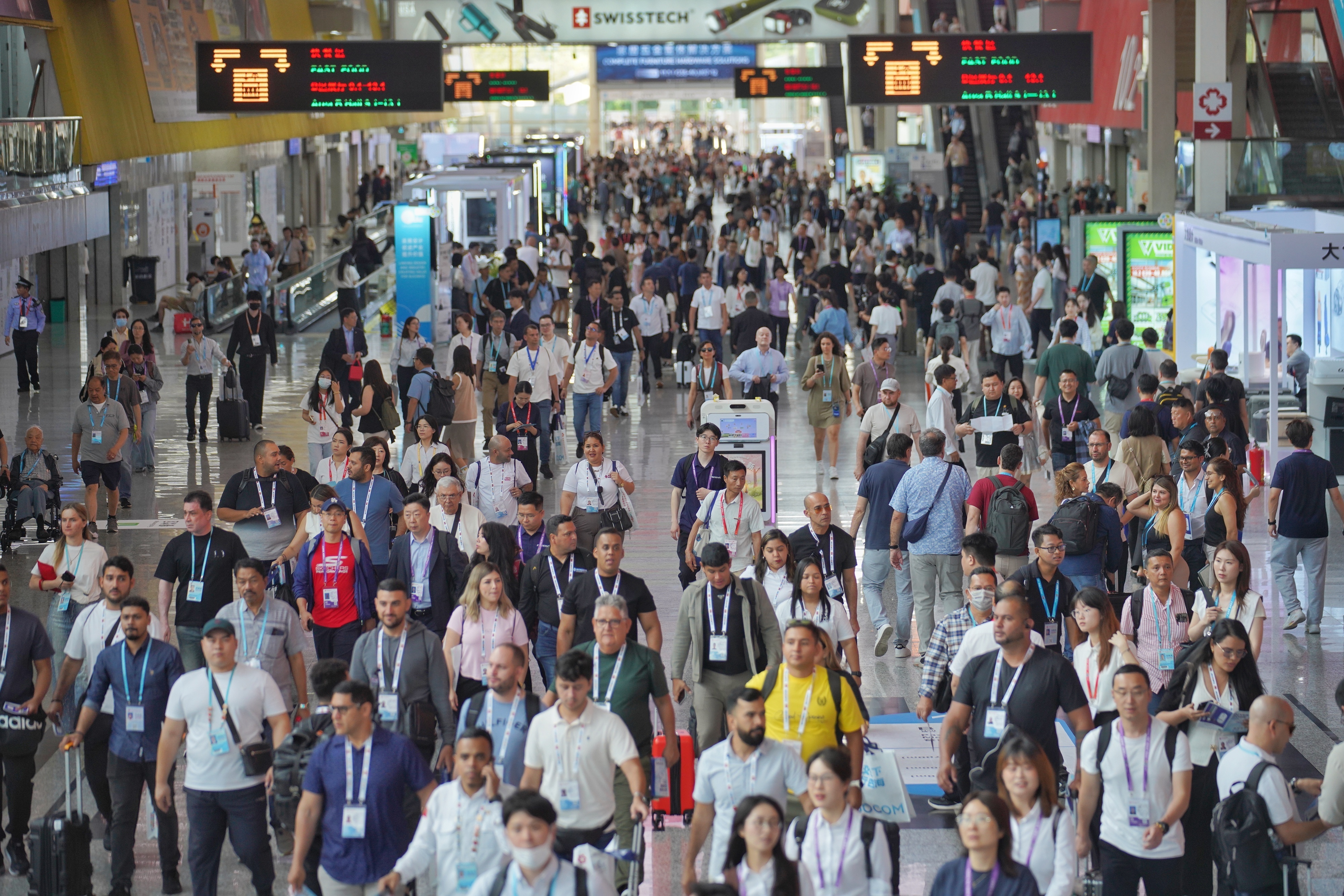 广交会首日,广州地铁四号线、八号线通过增加上线列车、备用车上线加开、空车定点投放等措施有效提升运力,采用展馆广播、增加标识指引、志愿者协助等方式加强现场指引,引导更多客商选择地铁十一号线出行;海珠有轨电车根据客流情况优化运营调度,提升琶洲区域公共交通疏运能力,首日地铁疏运客流39.6万人次。