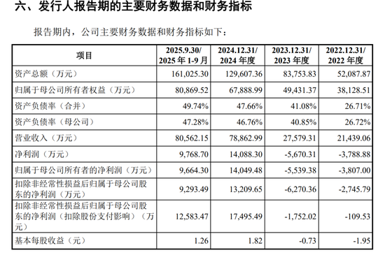 业绩来看,报告期内该公司营收分别为2.14亿、2.76亿、7.89亿以及前9月的8.06亿,营收增速爆发式增长;利润方面,22年、23年尚处于亏损状态,24年扭亏为盈利1.4亿,25年前9月盈利0.97亿。此外,研发投入保持在25%左右。2026年一季度营收、利润均实现翻倍增长。