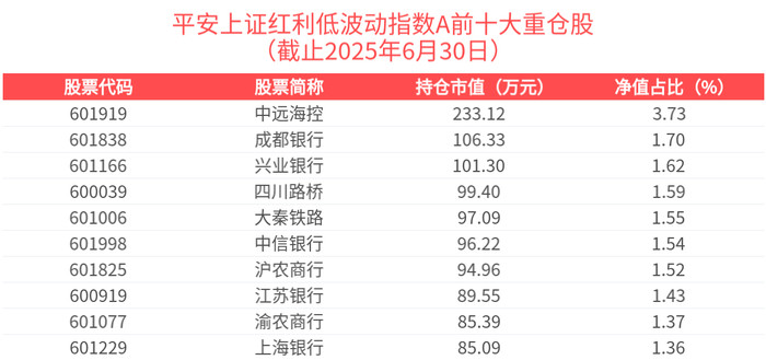平安上证红利低波动指数A紧密跟踪上红低波指数,上证红利低波动指数选取50只流动性好、连续分红、红利支付率适中、每股股息正增长以及股息率高且波动率低的证券作为指数样本,采用股息率加权,以反映分红水平高且波动率低的证券的整体表现。截止2025年6月30日,平安上证红利低波动指数A指数基金前十大重仓股分别为中远海控、成都银行、兴业银行、四川路桥、大秦铁路等,前十大权重股合计占比17.41%。
