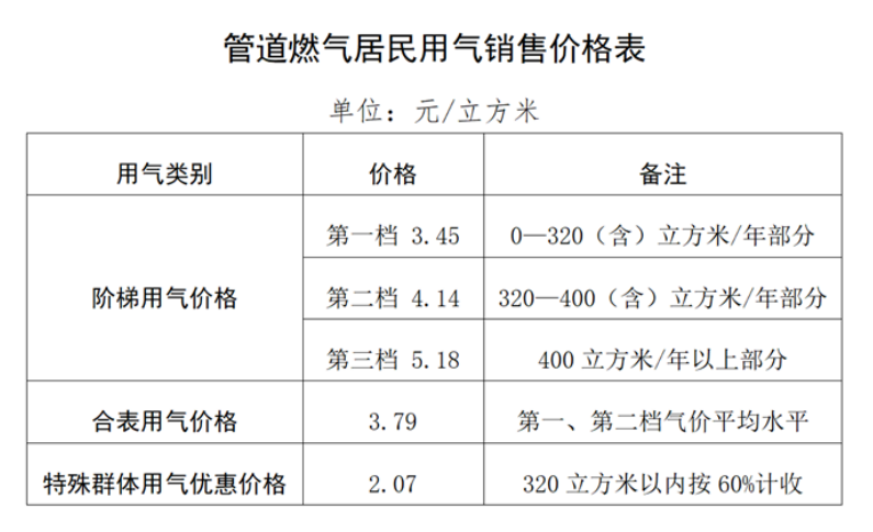 管道燃气居民用气收费现行标准。
